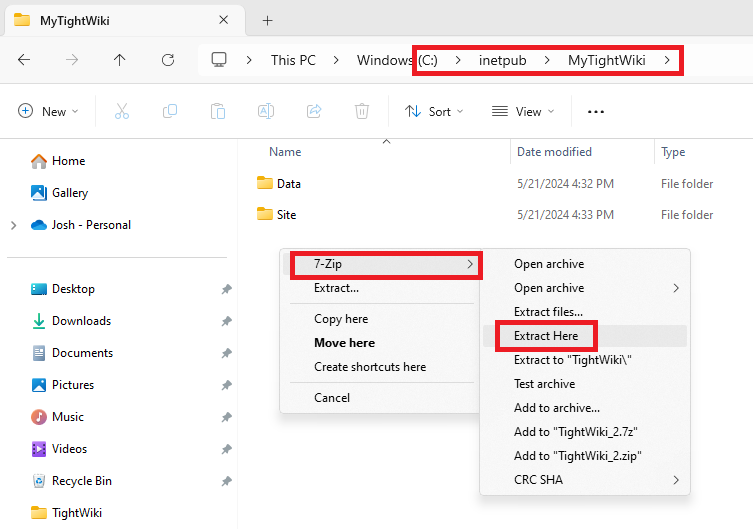 Download the latest version of TightWiki.zip and extract it to the new directory we just created Here we are using 7-zip to extract to C:\inetpub\MyTightWiki.